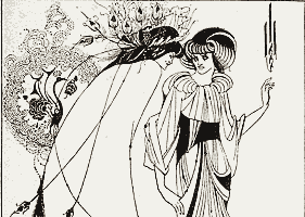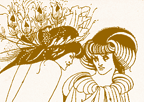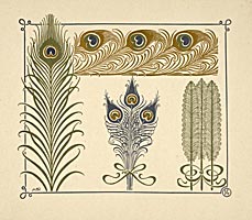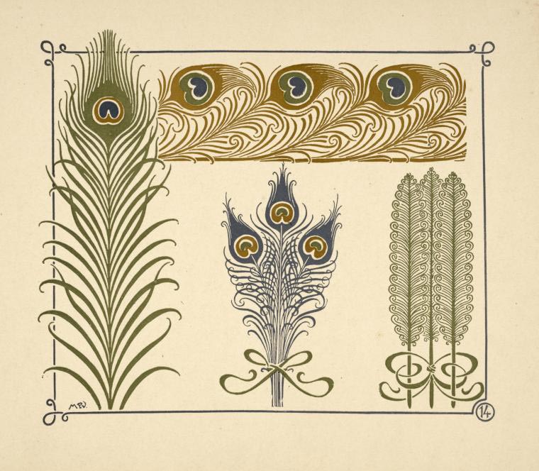 z Art Nouveau robbanás - az 1900-as párizsi világkiállítás - nyomán a páva és pávatoll grafikák már minden iparművészeknek szóló mintakönyvben szerepelnek. Az alábbi illusztráció alkotója Verneuil, M. P. (Maurice Pillard), készült 1900-banA