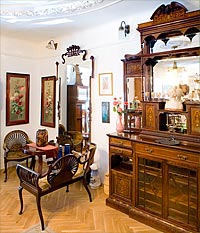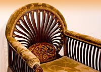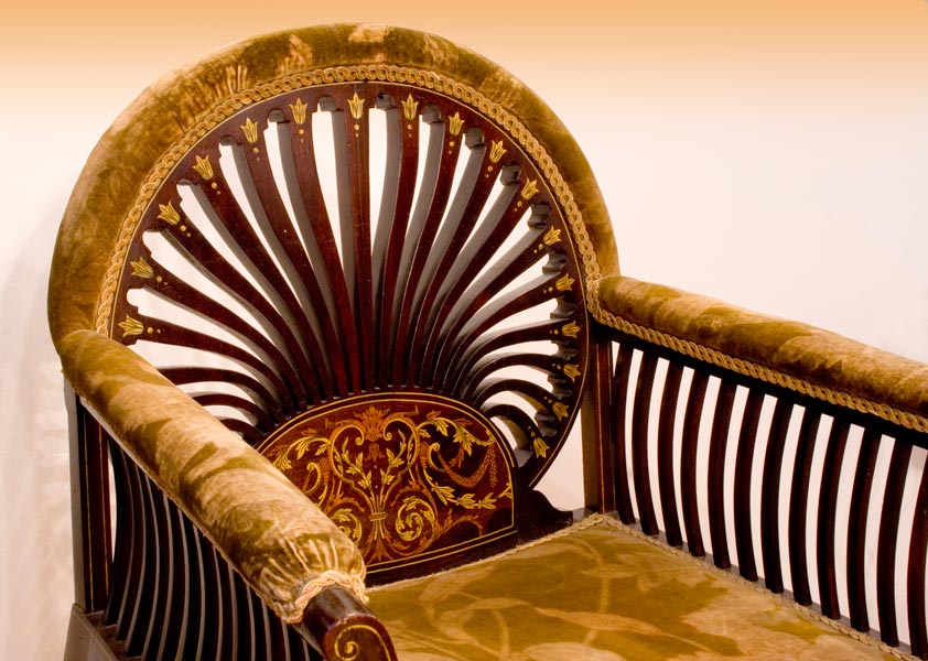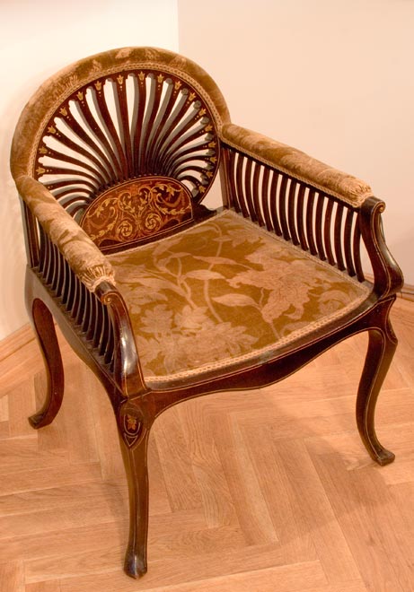 Magyar Szecesszió Házából sem hiányoznak a pávafark mintát használó bútorok. Itt egy széket mutatunk be, egy kolekció részeként. Érdekessége, hogy a támla hajlított elemes, franciás vonalvezetése mellett Angliában gyártottákV