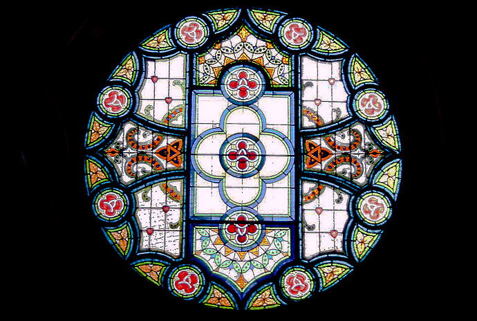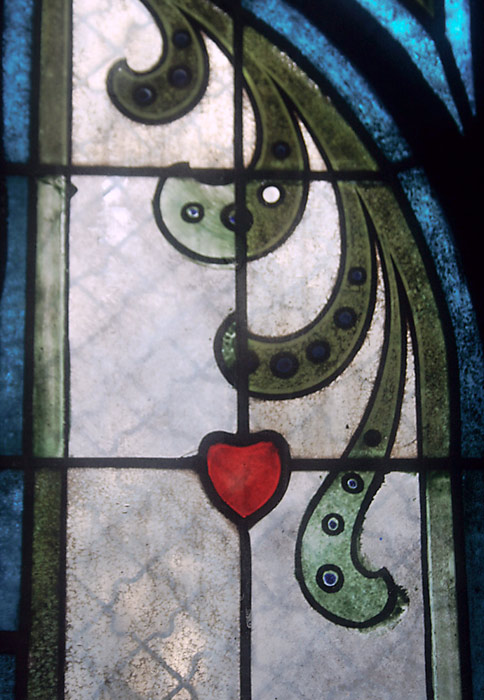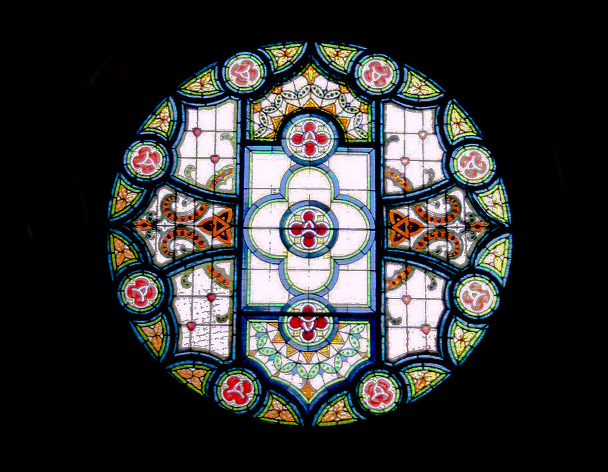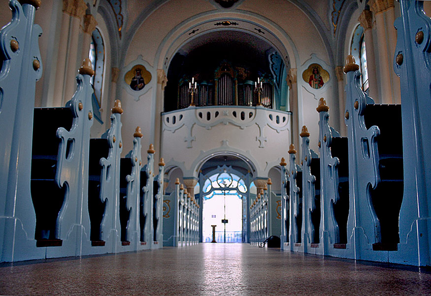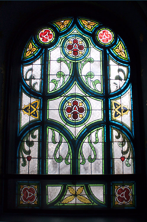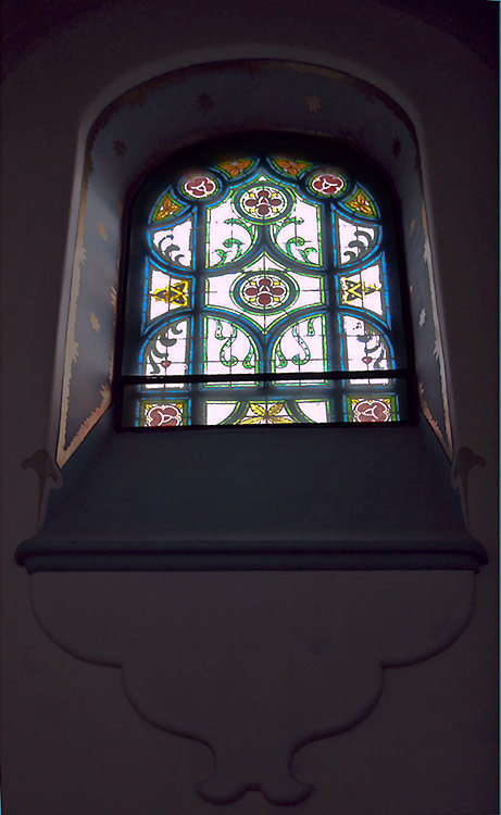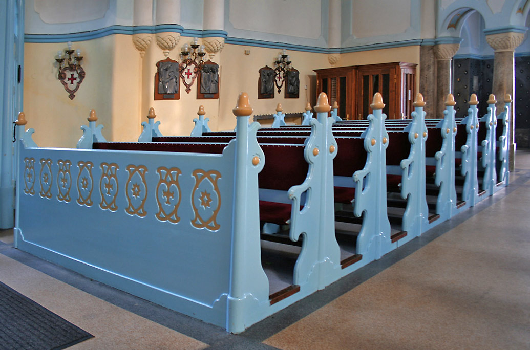templom belső minden részletét Lechner Ödön tervezi, sokszor át is tervezi. Nála is egyenrangú volt az iparművészet az építészettel, a stílusbeli összhangot, a részletek művészi tökéletességét ugyanúgy feladatának tartotta, mint a legnagyobb art nouveau művészek, Horta vagy Gaudi. (KATT a képre, a padsorokat mutatjuk itt meg)Az ólomüvegablakok