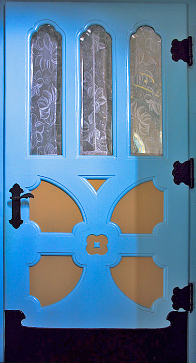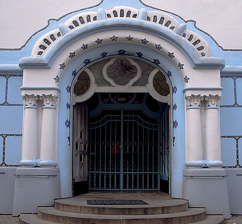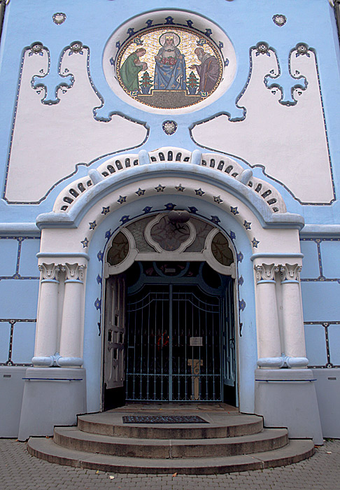 mi a fenti képeslapon a sárga falreliefeket, falszalagokat illeti a színezés helyes, a korabeli leírás ezt megerősíti. "A széles falfelületeket kívül sárga, lapos reliefekkel szakította meg a műépítő, ezekkel tagozta többféle alakban: kereszt, kör, ablaktámláról lecsüngő magyaros ornamentikával, köztük kék-fehér mozaikcímerekkel, rózsákkal, füzérekkel és a Szentháromság jelképével, a háromszögbe foglalt szemmel." (Szyllaba Emil: A pozsonyi királyi katolikus főgimnáziumnak Árpádházi Dicsőséges Szent Erzsébetről nevezett Erzsébet királyné emléktemploma). Az eredeti sárga falreliefek és a kék tető ill. mozaikok szépen emelték ki egymás színét, viszont azt el kell ismerni, hogy a falak kékre való utólagos átfestése ha nem is az eredeti terv szerinti, de telitalálat.A főbejárati kapu - a templom egyik fő ékessége