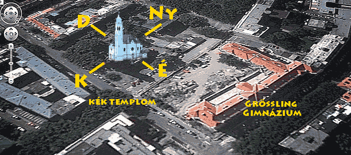 echner a kijelölt telken változtatott, saroktelket követelve, úgy módosítva a templom elhelyezését, hogy ezáltal két bejáratot kapjon, egyet a diákoknak az északi oldalon szemben a Főgimnáziummal, másik a keleti oldalon a lakosság részére. Ezzel Lechner a hagyományos templom tájolást (főbejárat nyugaton, másodkapu pedig délen) teljesen megfordította a jobb bejárás, a funkció kedvéért. (Katt a fenti képre az északi homlokzat képeiért)A Kék Templom kékségéről
