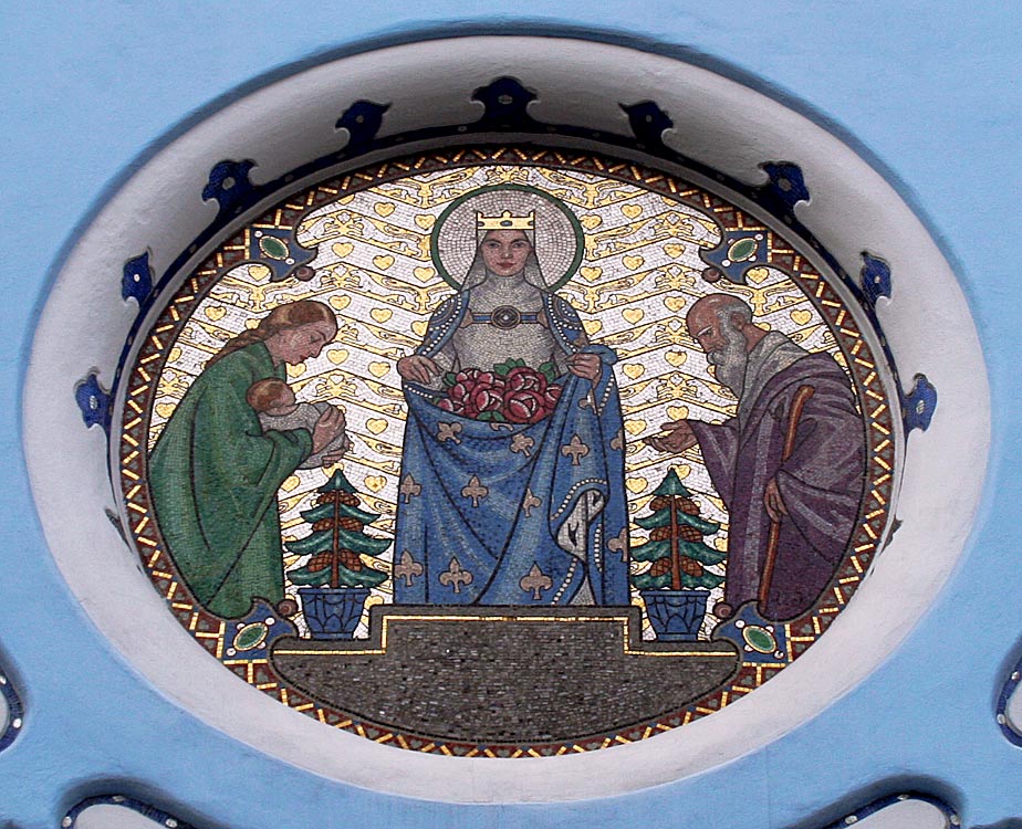 kapu felett levő mozaikkép Árpádházi Szent Erzsébetet ábrázolja a "rózsák csodája" jelenetben. Erzsébet élelmet vitt a szegényeknek, de amikor a szigorú földesúr ezért megrója, a lány hirtelen letagadja, mondván csak rózsa van a kötényében. És ekkor isten valósággá váltja az ártatlan hazugságot, a kötényben a kenyérből rózsák lesznek. (Katt a fenti képre a képsorozathoz) A jelenet a krónika írója szerint télen játszódik le, talán karácsonykor, erre utalhat a két fenyőfácska is, sőt még az eszményi háttér aranyló díszei is.E
