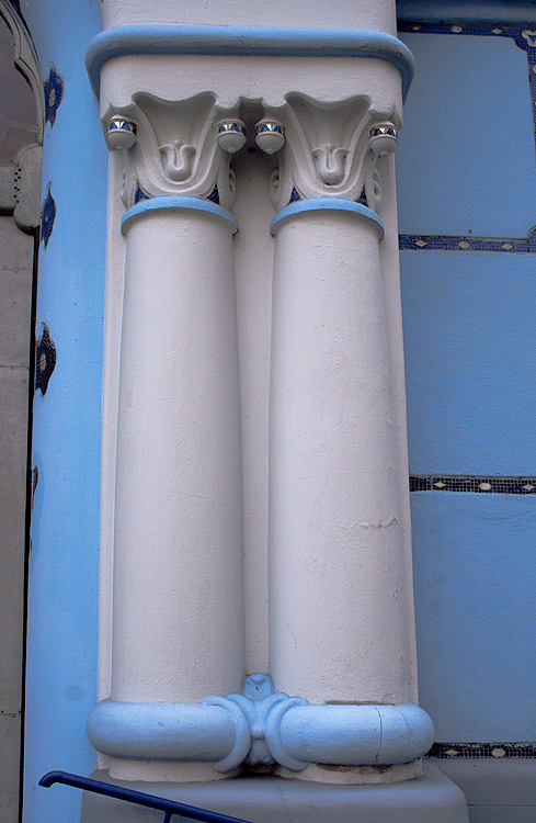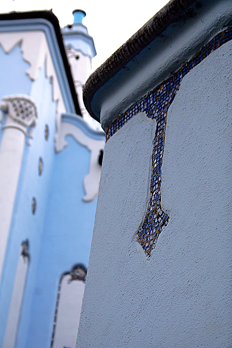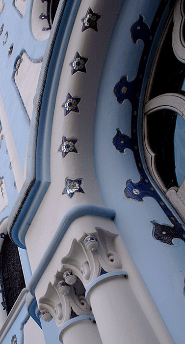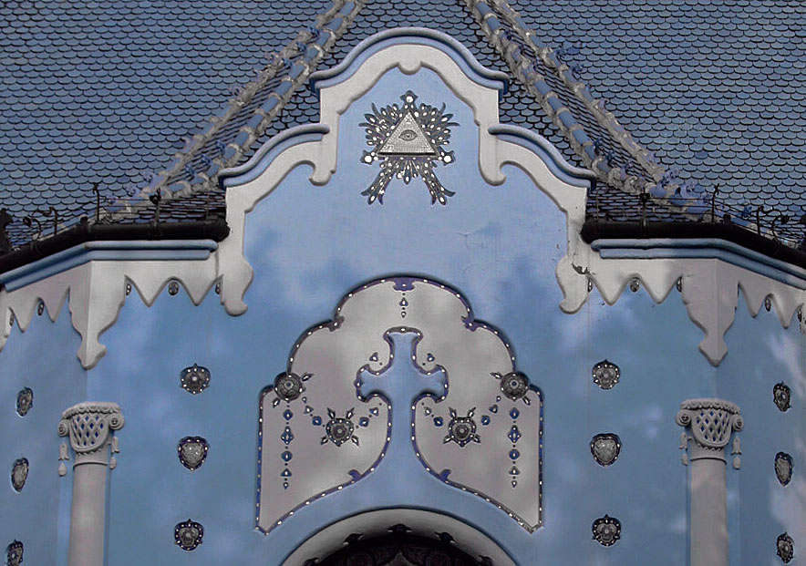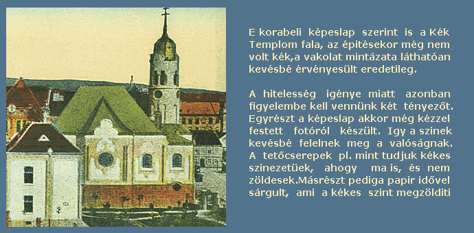 templom eredeti színe szürke lehetett a vizsgálódások szerint, a kék jelzőt a Zsolnay gyárban készített, e templom számára égetett kék tetőcserepek színe után illetve a falakon a kék mozaik díszek, mozaiksorok színe után kapta.A