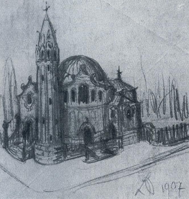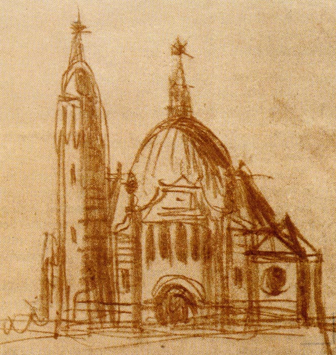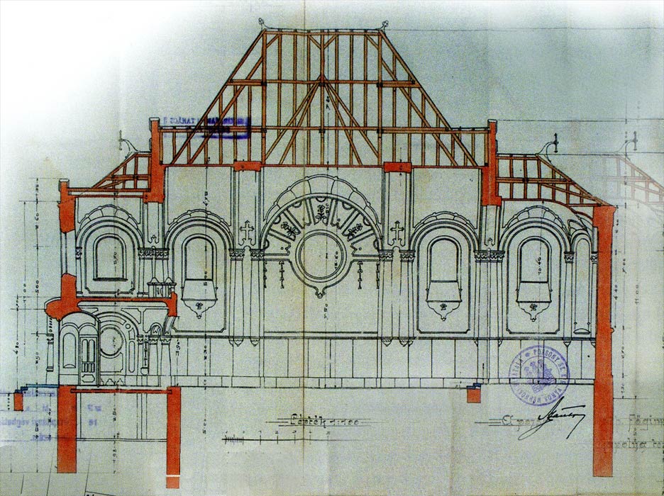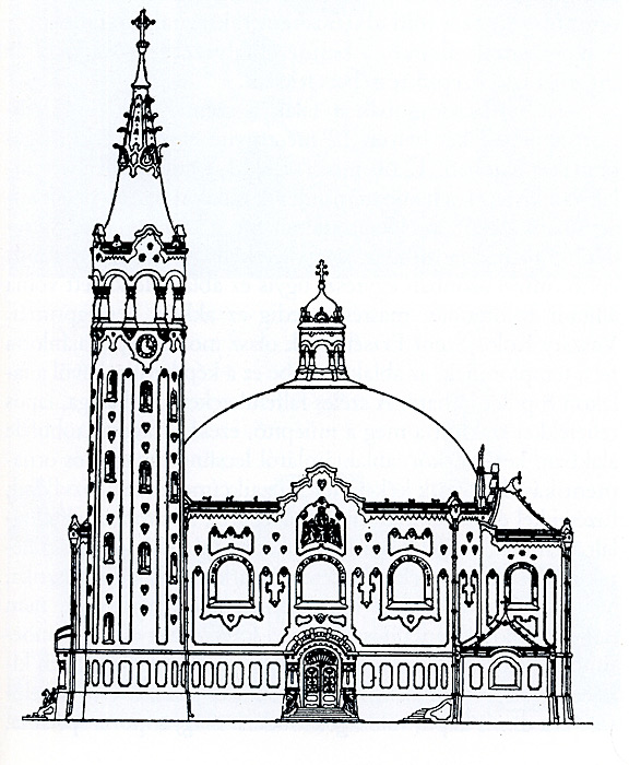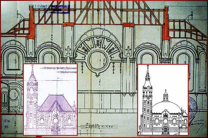 fenti tervrajzokban (KATT a fenti képre) találunk egy első változatot, ahol ovális alaprajzon a templomot kupola fedi - mitöbb vasbetonból tervezve - amit később a megrendelők kérésére és talán anyagi okokból is hagyományosabb tetőre kellett cserélnie. Tény, hogy sok tervváltozat készült - az egyik a Japán Kávéháznak az asztalán készült (lásd a képsorban a vázlatot) - és Lechner makacsul kereste a legjobb megoldásokat. Amikor a Minisztérium is sürgetésre fogta, Lechner legendás válasza ez volt: "A művészetet nem lehet sürgetni". A minisztérium reakciójáról nincs tudomásunk, de a műteremben mindenki elképedt a mester merészségén.A templombelső