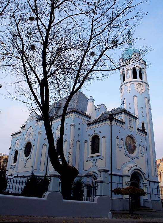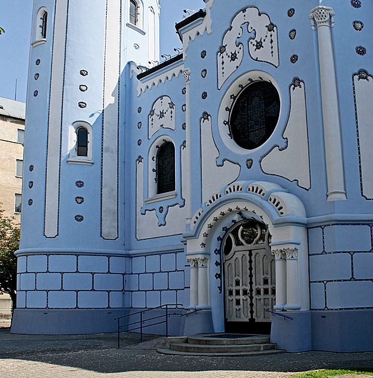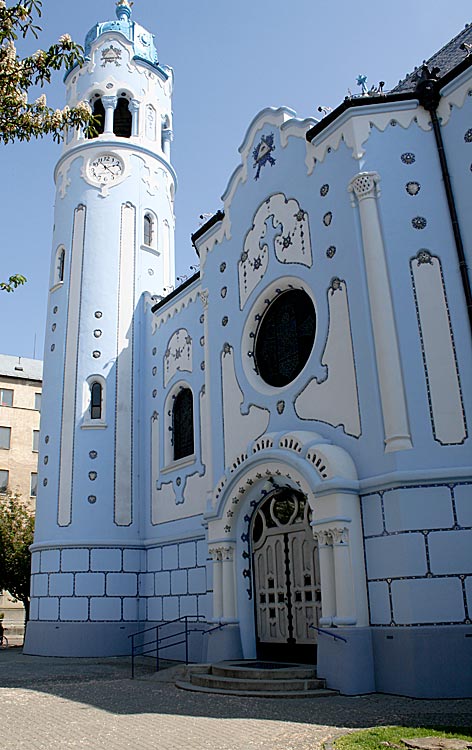 z Árpádházi Szent Erzsébetnek (aki állítólag Pozsonyban született) szentelt templom mérsékeltebb anyagi alapjait sem volt könnyű összegyűjteni, Lechner az eddigi nagy épületeitől eltérően kevesebb kerámiát használ, a téglaszalagok helyett pedig inkább falszalagot és magyaros formájú falfelületeket tervez. Ezzel a homlokzati falak sokkal mozgalmasabbá váltak még az addigi Lechner épületekhez képest is. A Zsolnay gyár kékes mázas cserepei a tetőn, az ezzel rímelő kékes színű mozaikcsíkok és betétek a falakon adták a templom Kék jelzőjét.Az északi homlokzat kapujának története