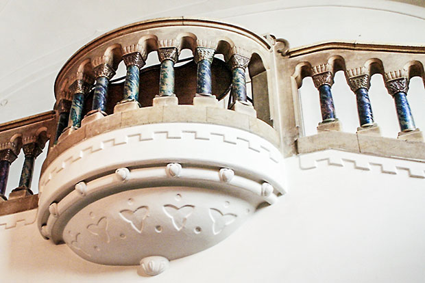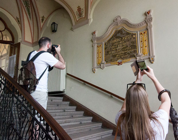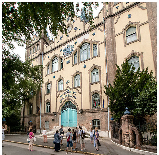 hullámzó attikafal a tetődíszítésben, a homlokzatot díszítő téglaszalagok, a Zsolnay kerámiabetétek mind Lechner Ödön kezdeményezése révén terjedtek el a magyar szecessziós építészetben. Az iskola belsejében, a Nádor Terem rendezvényszervezője, Göllesz Zoltán mutatta meg, beszélt az épületet részleteiről.L
