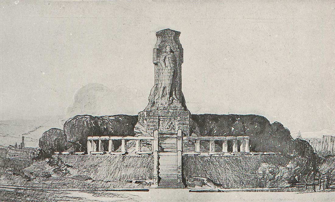 ipcsében a monumentumláz ölt el mindent. Emléket emeltek a kőnek, vasbetonnak és a vasnak. A követ a Völkerschlachtdenkmal képviseli. Igaz, hogy a magva ennek is vas-beton, de úgy felöltöztették kőbe, hogy a konstrukciós anyagából egy csipetke se látszik ki. A falazat kőkockái közt van kilencméteres is. S a szobrász Metzner pedig ugyancsak nagyra növesztett Titánokat és Rittereket faragtatott ki egyiptomiasan lesíkozva, némelyik eléri a 15 méter magasságot is. Kár, hogy a berlini Rheingold-vendéglőben ugyanazok a figurák egyhuszadléptékben csokoládészínűre pácolt fába faragva szintén láthatók."