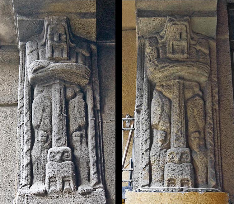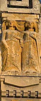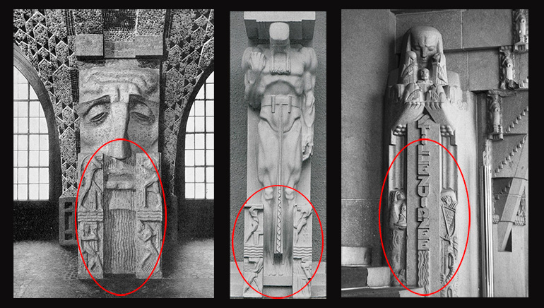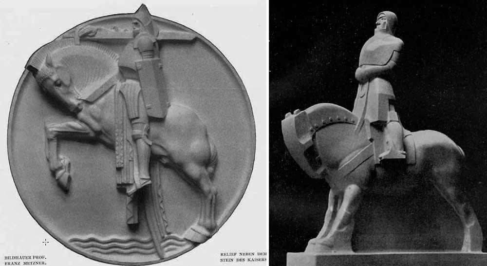 ranz Metzner kettős szoboralakjai és a mögöttük levő pillérek egysége az egyiptomi pillérek és szobrok tökéletes egységét idézi. Az egyiptomi építészek ugyanis a templomokat és a szobrokat egymáshoz tervezték, az épületszobrászat magas fokát valósítva meg.Kőszobrok - "egyiptomiasan lesíkozva..."