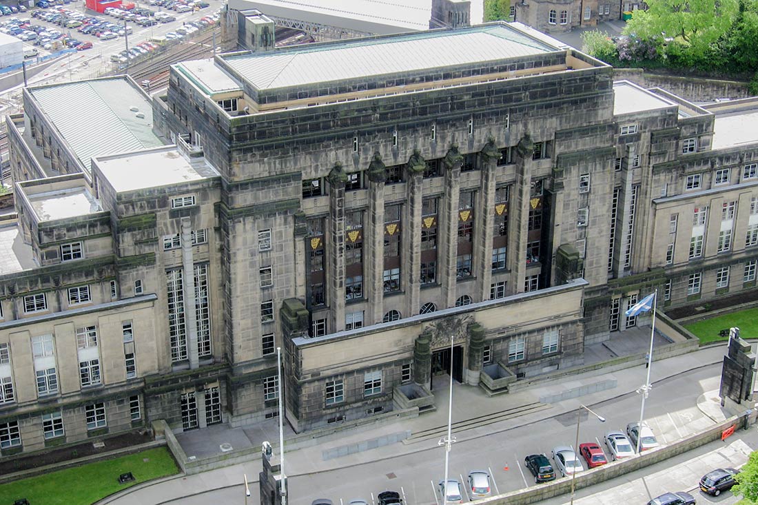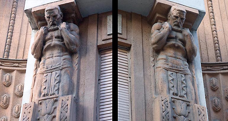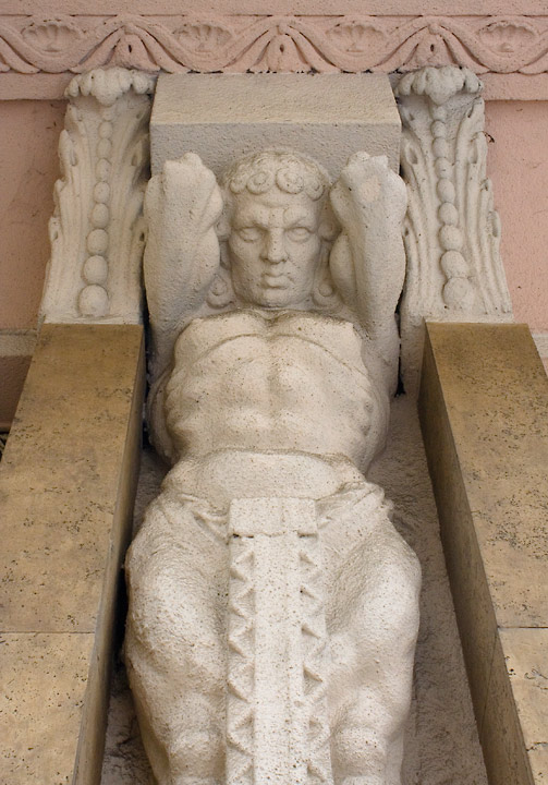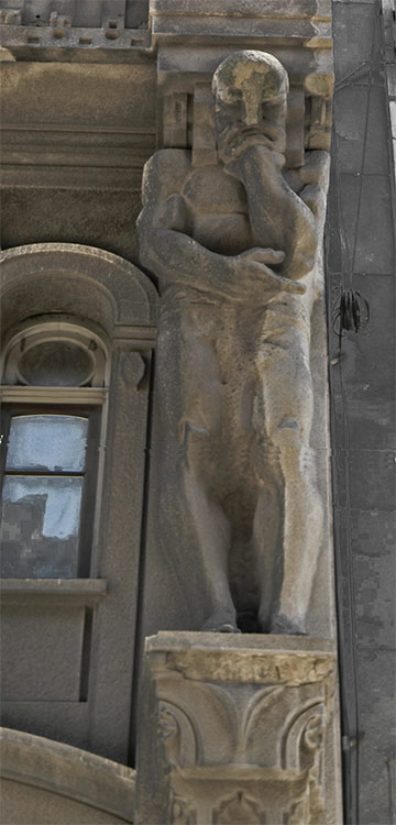 z öt méter magas atlasz szobrok, a hármas neoreneszánsz ablakok sorozata közt, az ács, kőműves, lakatos, állványozó, szobrász, a művezető, és az építész alakját formázzák, jelképezik a leirások szerint, de ezek nem tűnnek egyértelműen meghatározhatóknak. A századforduló modern irányzataihoz köthető, hogy a historizmustól eltérően ezek a szobrok, a modern technika jegyében nem kőből, hanem vasbetonból készültek. Szintén elszakadást jelent a historista épületszobrászattól, hogy az épület különböző részein a szobrok a helyi állatvilág alakjait ábrázolják, pl. kondorkeselyűt a tetőn, pigvineket az erkélyeken, stb. Részletes bemutató a fenti képsorban (12 kép)E