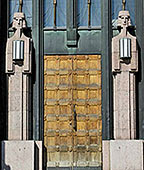 gyébként már 1910-ből láthatunk egy geometrizáló szobrot Frank Lloyd Wright épülethez kapcsolódva. Ez a Nemzeti bank épülete, Mason City, Iowa. Szobrász: Richard Bock, 1910. A szobor két oldalán a mértani ornamentikájú lámpákhoz két érdekes észrevétel: egyrészt megelőzik időben a Helsinki pályaudvarnál látott lámpás őrszobrokat (akik viszont a kezükben tartják a világító mértani testet) másrészt itt a lámpaszerkezet (kiugró lapos tető, négyzetes hálós osztás) akár miniatűr Wright épület is lehetne (mint például az itt fent látott Bogk ház)