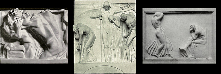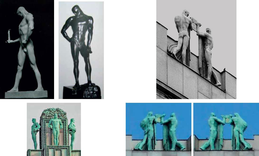 A fenti első négy képen Franz Metzner műveit látjuk (Lipcse illetve Bécs) a második négyen egy-egy budapesti épületdekoráció, a magyar századforduló építészeitől.Bevezető az építészet e szakaszához