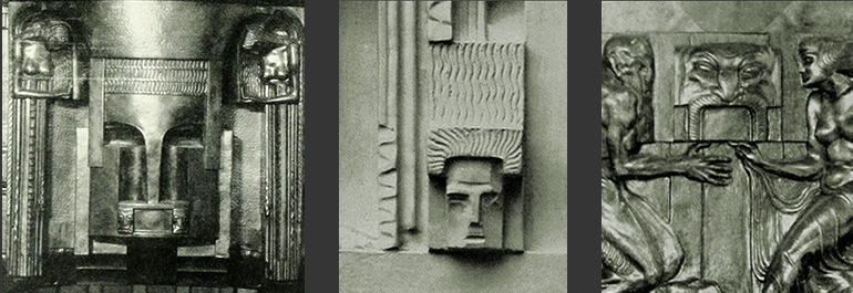 att a képsorokra: fent a legelső, az uttörő szerepű Franz Metzner dombormű 1905-07, majd korai budapesti épületmaszkok, 1909-11, alatta 1909-es illetve 1916-os amerikai példák majd itt lentebb ismét egy budapesti sorozat három képben, végül a legalsó sorban Torino, magyar világkiállítási pavilon belső részlete 1911-ből, valamint későbbi példák Európából és az USA-ból (adatok a képsorban a képek alatt)
