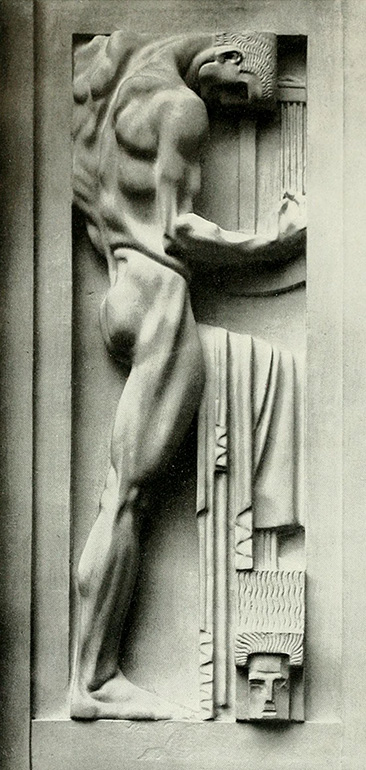 ranz Metzner szobra a Föld látható a középpontban, fentebb több szögből is megmutatjuk. Jelentőségét a monumentális szobrászat szemszögéből, valamint korabeli fogadtatását lentebb tárgyaljuk. Körös-körül a terem belsőépítészeti kialakítása szintén Metznerhez kötődik, ott azokat az atlaszokat láthatjuk amelyekhez teljesen hasonlók felkerültek a Zacherlhaus, a már a modern építészetet megelőlegező épületére (tervezte Josef Plečnik, épült 1903-1905 között). Az épület Bécs belvárosában látható (lásd az alább indítható képsorozat képeit). A második képen viszont, egy valószínüleg később készült munka, a "Dombormű egy berlini emlékműhöz", melynek illusztrációját a Deutsche Kunst und Dekoration folyóirat 1907-es száma hozza (89 oldal).
