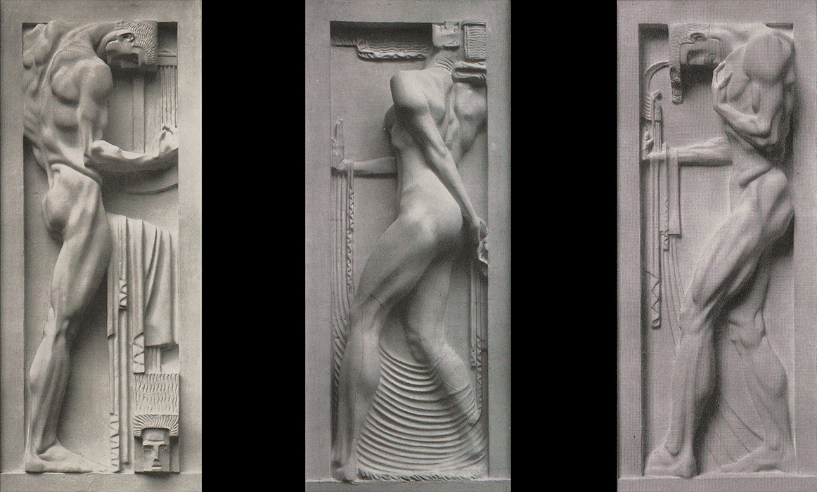 ok mester (például Metzner) úgy fogta fel feladatát, hogy a szobrász váljék hát egy kissé építésszé. A tömegek síkjainak túlerős hangsúlyozásával a díszítő plasztika építészeti bélyegeket vett magára. "