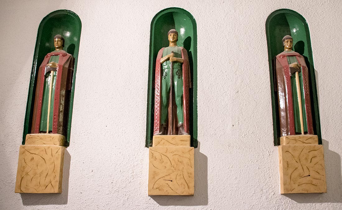 z alábbi alkotás jól példázza az art deco szelídebb geometrizálását a Nemzeti Kegyhely egy részletén (National Shrine of the Little Flower Basilica Catholic Church, Royal Oak, Michigan). E Nemzeti Kegyhely szobrait Rene Paul Chambellan készítette többnyire klasszicizáló art deco stílusban, de domborműszerűen az itt látott mértani elemekből is komponált a figuratív részlet köré. Ettől eltérő stílusban ugyan de hasonló elhelyezésben a Kyffhäuser sarokdekoráció maszk juthat eszünkbe.
