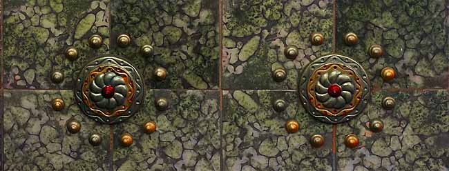 majd az épületek irizáló burkoló csempéi fehéres és sárgás (ezüstös, aranyos), valamint türkiz