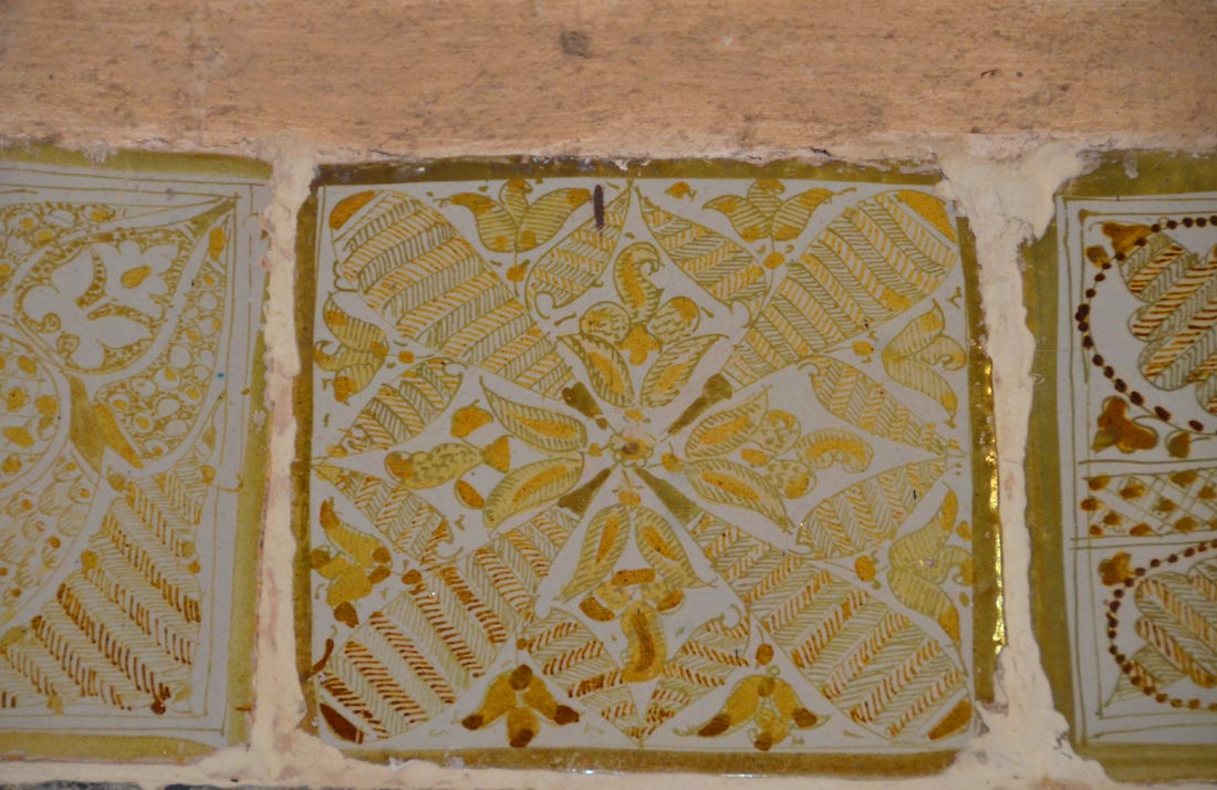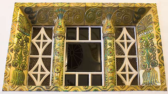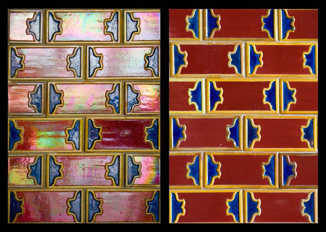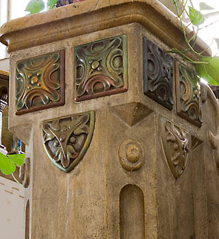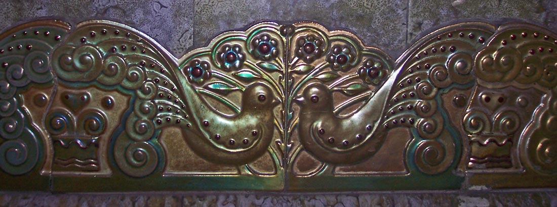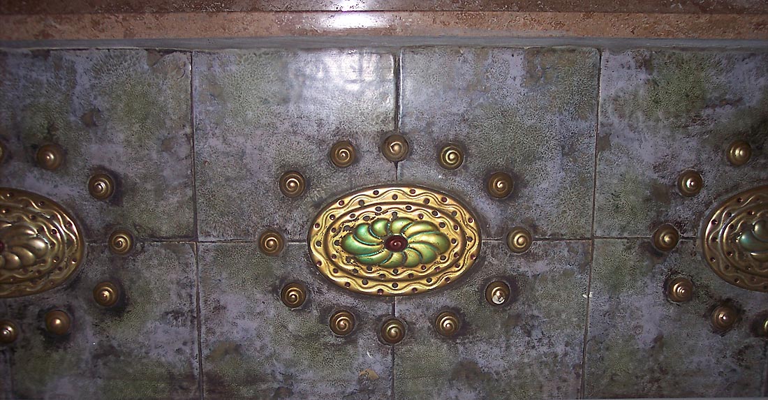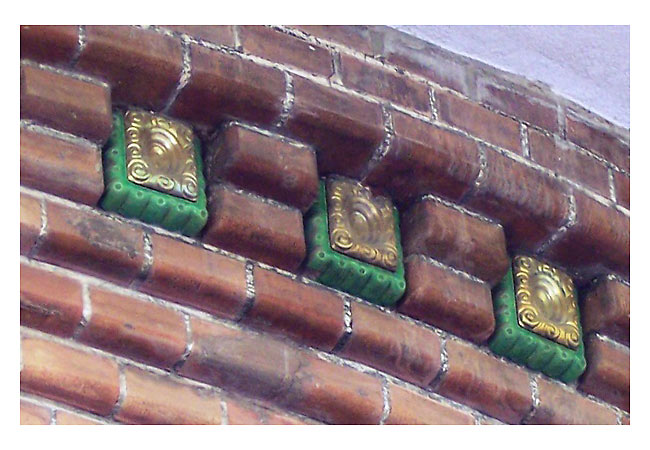 igazi kuriózumként lüszteres építészeti kerámia: betétdíszek láthatóak.