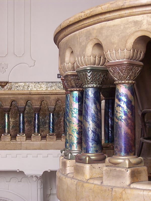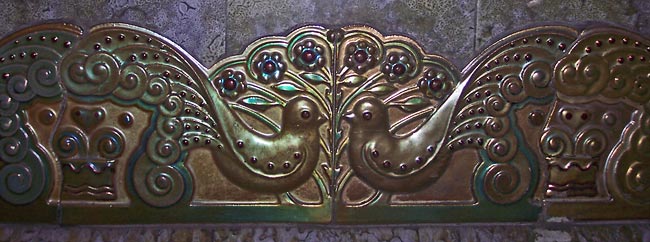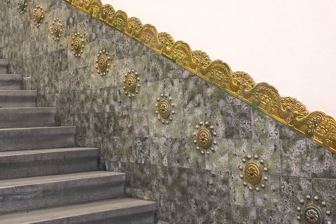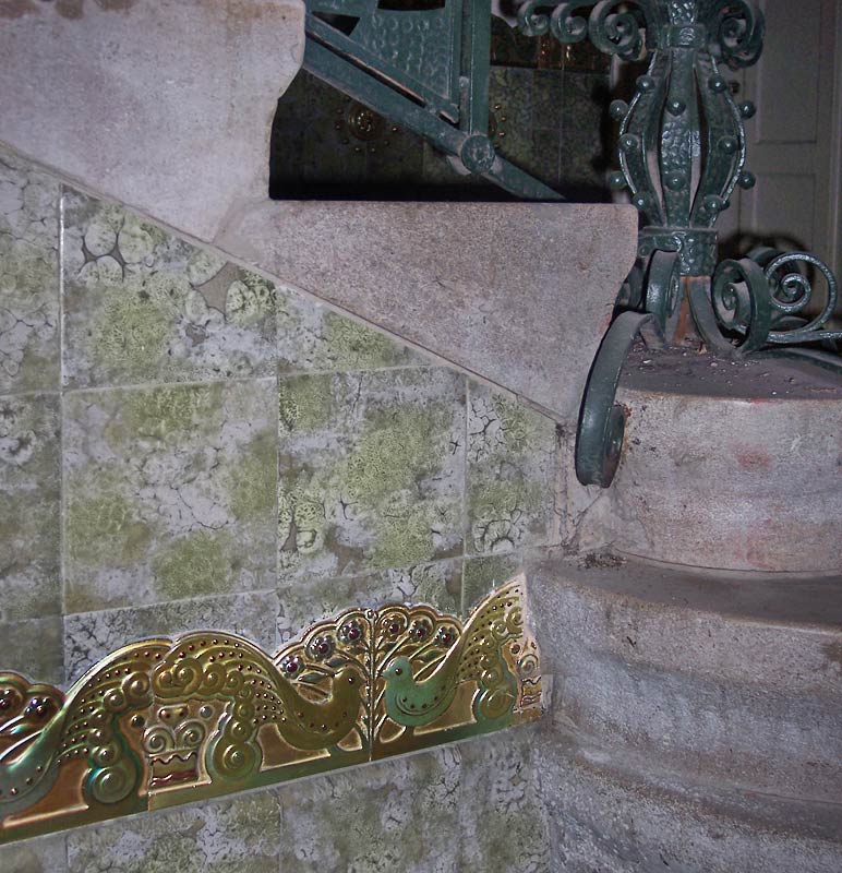 főkapun belépve, a kétirányú lépcsősor jobboldali szakaszán, az eozin-pávás díszek mellett
