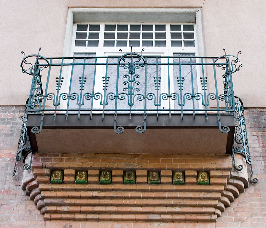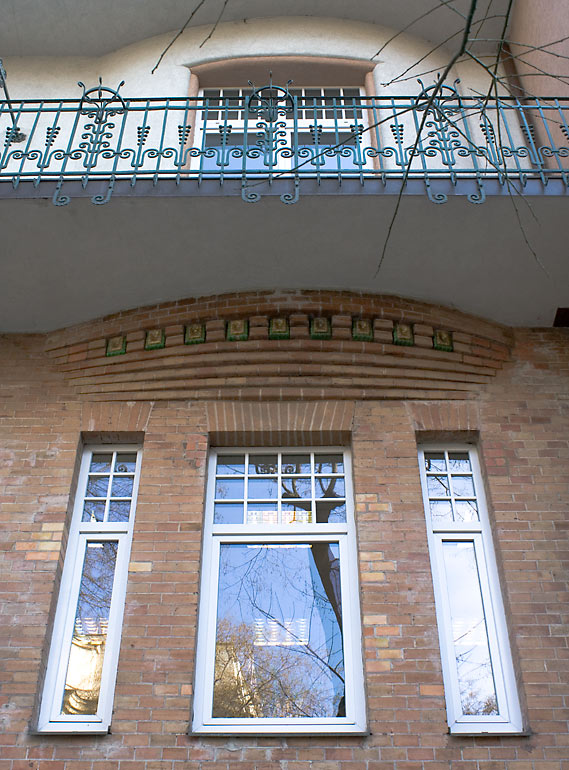 Meglepetésként fedezhetünk fel az épület homlokzatán is eozin díszítő elemeket. Lüszteres