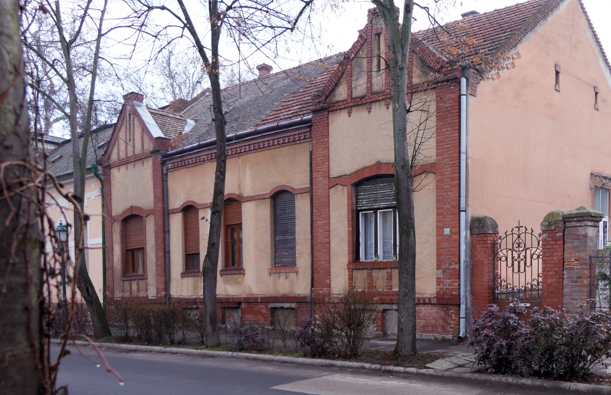 Leírás: L alaprajzú, kétszintes lakóház, homlokzatán szecessziós stílusjegyekkel.