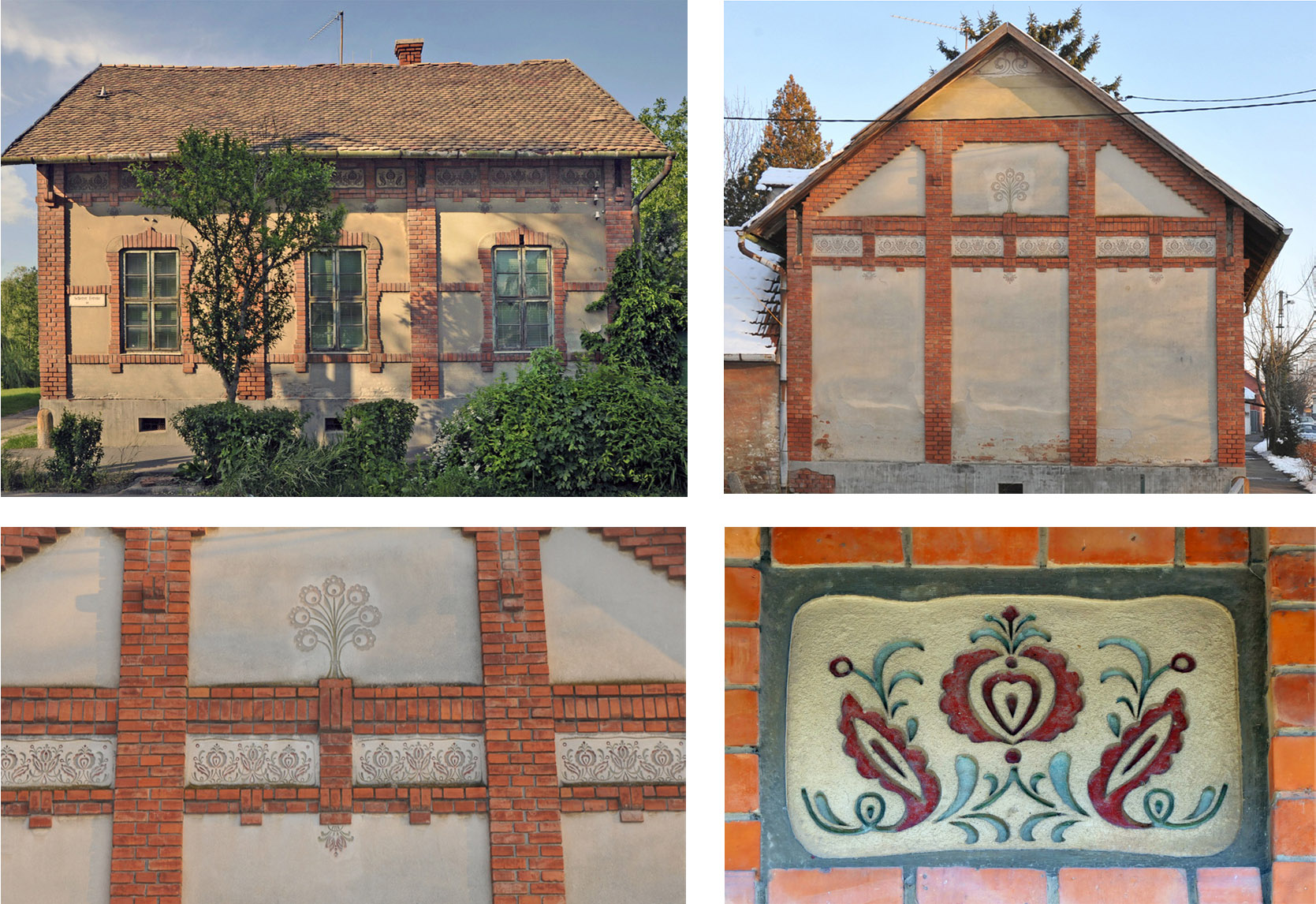 ívelő homlokzatai, szamárhátíves oromzatai, téglaszalagjai jellegzetesen sgrafittó-technikás,