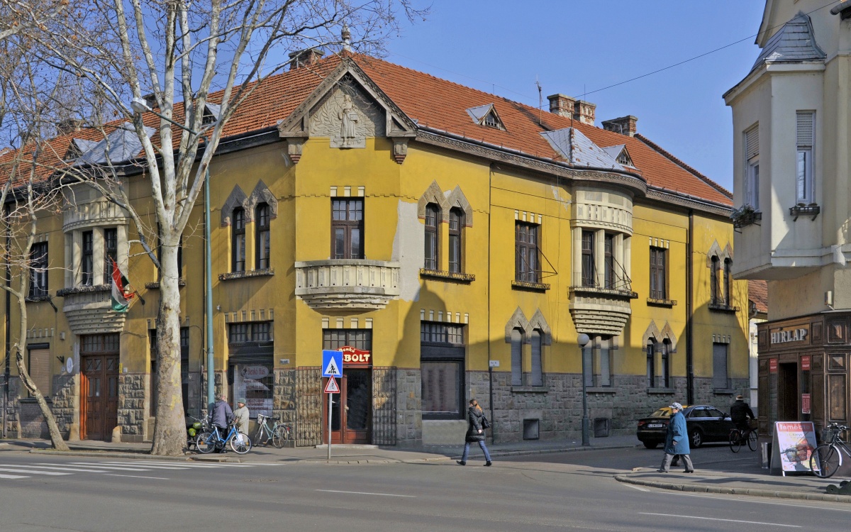 L alaprajzú sarki egyemeletes épület homlokzatán szecessziós stílusjegyekkel. Gipsz domborműve is van.