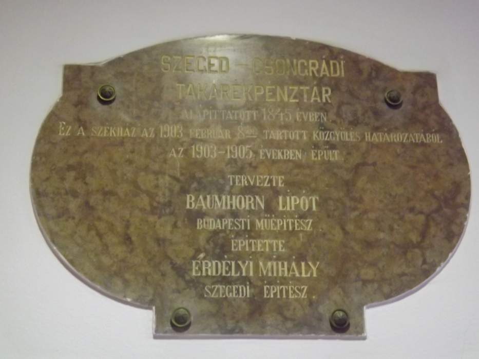 Mint Szeged városának egyik legkiválóbb közgazdasági tényezője, e takarékpénztár ez épületével nemcsak saját anyagi, hanem a város fejlődési érdekeinek is szolgálatot óhajt tenni.