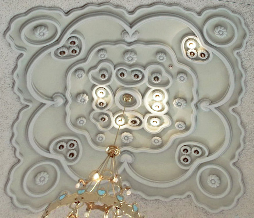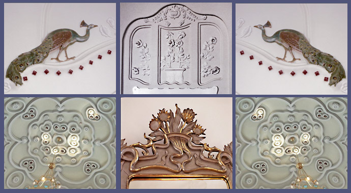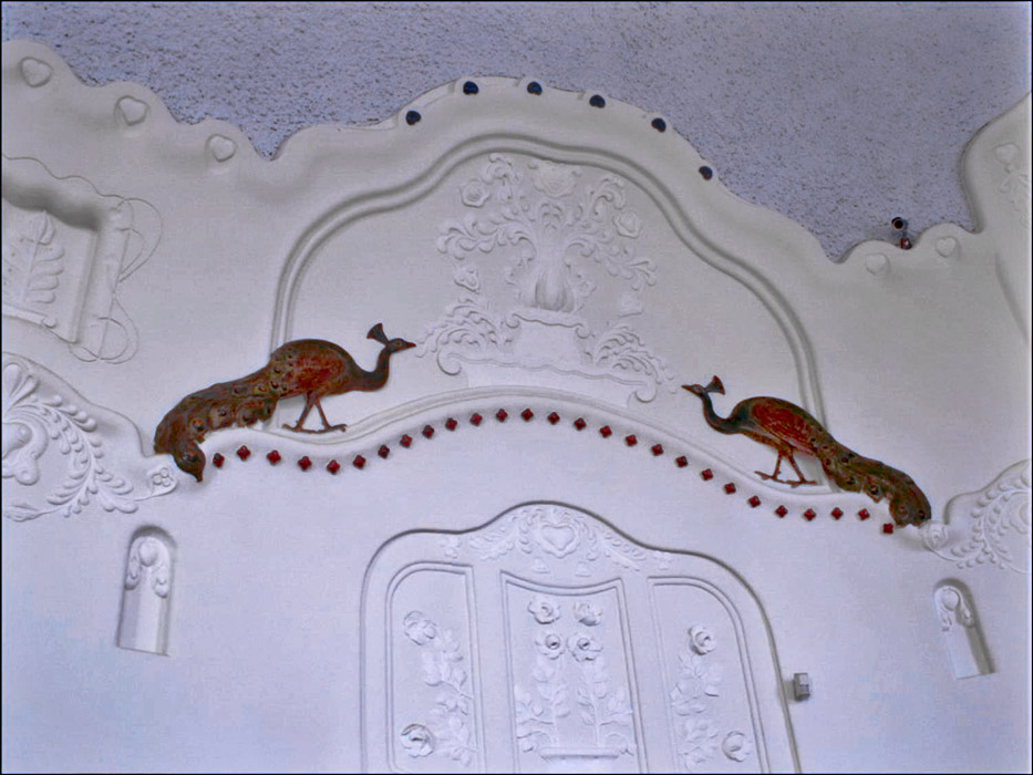 ogy a keleti, pontosabban kínai inspirációt is alátámasszuk mellékeljük néhány - többnyire Ming korszakbeli - tűzzománc munka képét. (Katt a fenti képre) Egyébként a tűzzománc formák, az erős körvonalakkal körbevett színfoltok a festőket is vonzották abban az időben, többek közt a Nabis csoport tagjait is. Köztük Rippl-Rónainak is volt egy ilyen periódusa a XIX század végén (de finomabb vonalakkal és sokkal mértéktartóbb színekkel).Cifrapalota. A belső díszítmények ma.