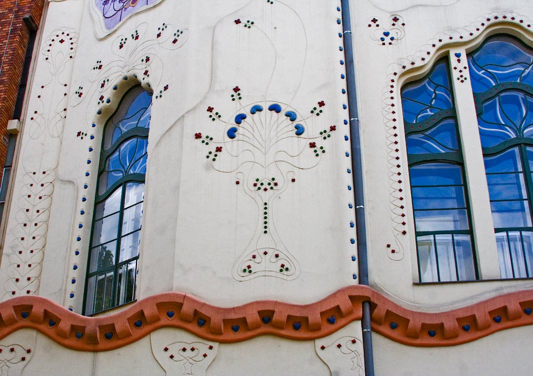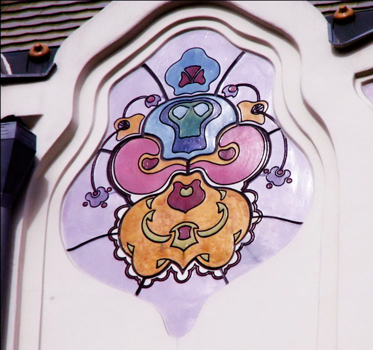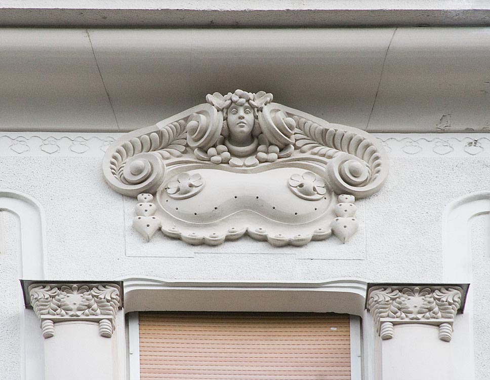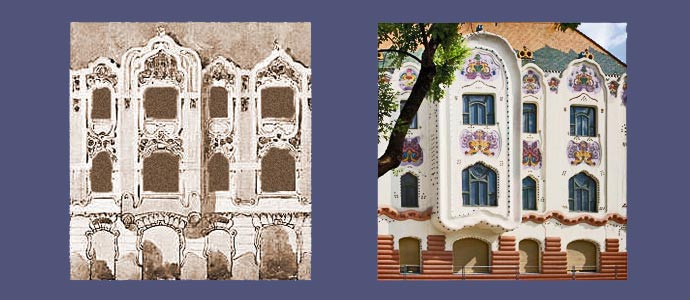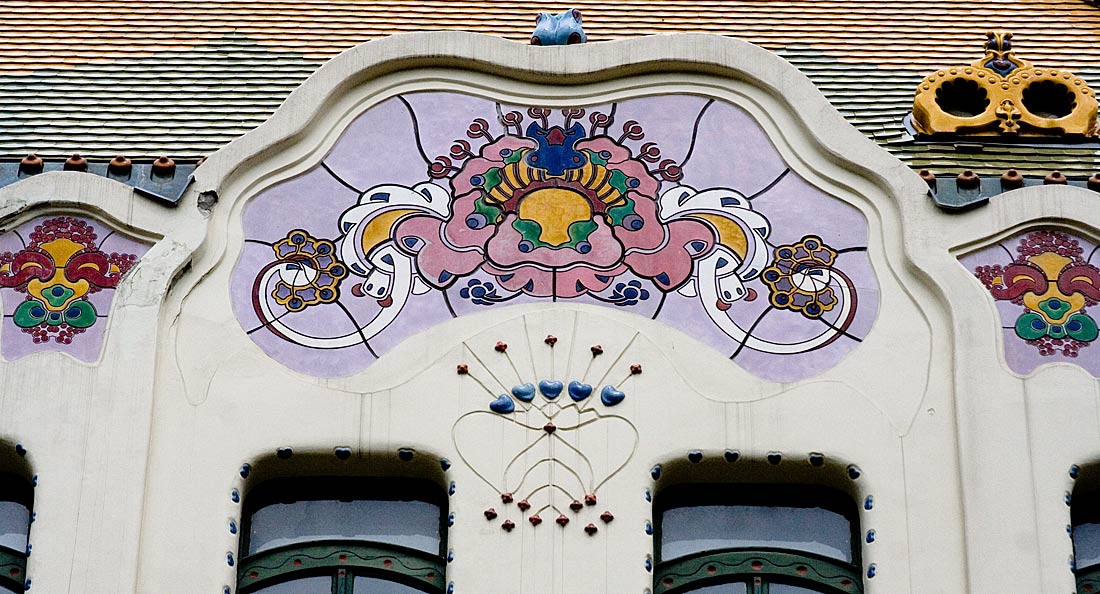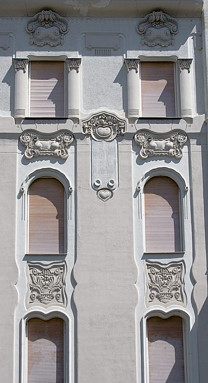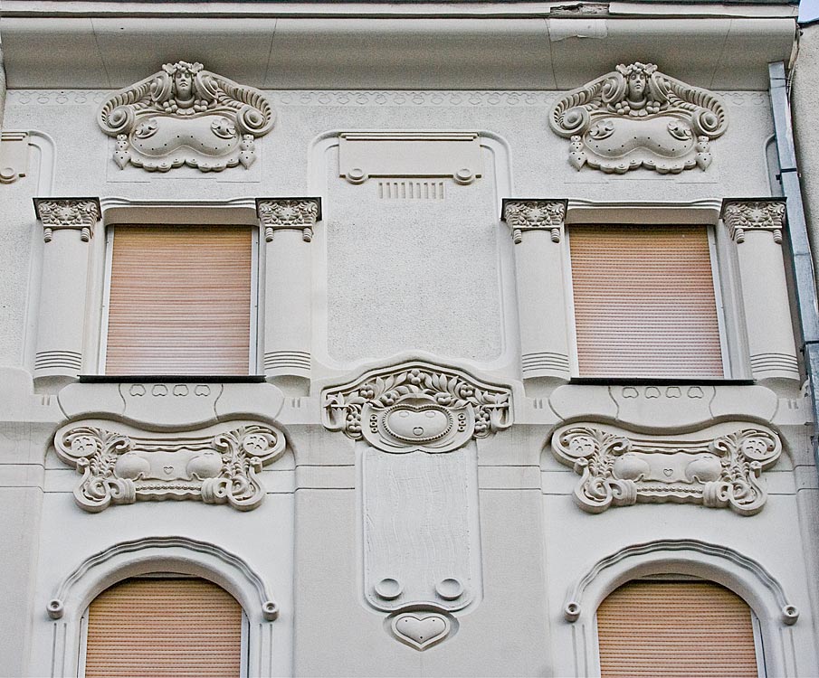 z épület első tervén a díszítés már szecessziós, de annak hagyományosabb módján veszi körbe az ablakokat. A két egymásfeletti ablakot körbevevő nagy keret pedig még bonyolult rajzolatú. A végső kivitelben viszont a homlokzat díszei már nem az ablak függvényei, azzal egyenrangú elemek és nem is akármilyenek, e díszek egyedülállóan fantáziadús dekorációk, melyek akár önálló művészi alkotásnak is elfogadhatók. A dekoráció viszonylag függetlenedik az épülettől, ahogy azt Európa élvonalában járó szecessziós építészeknél is látjuk ebben az időben.A