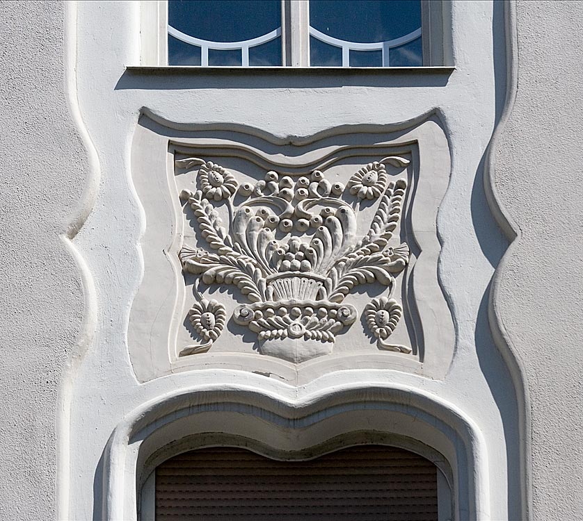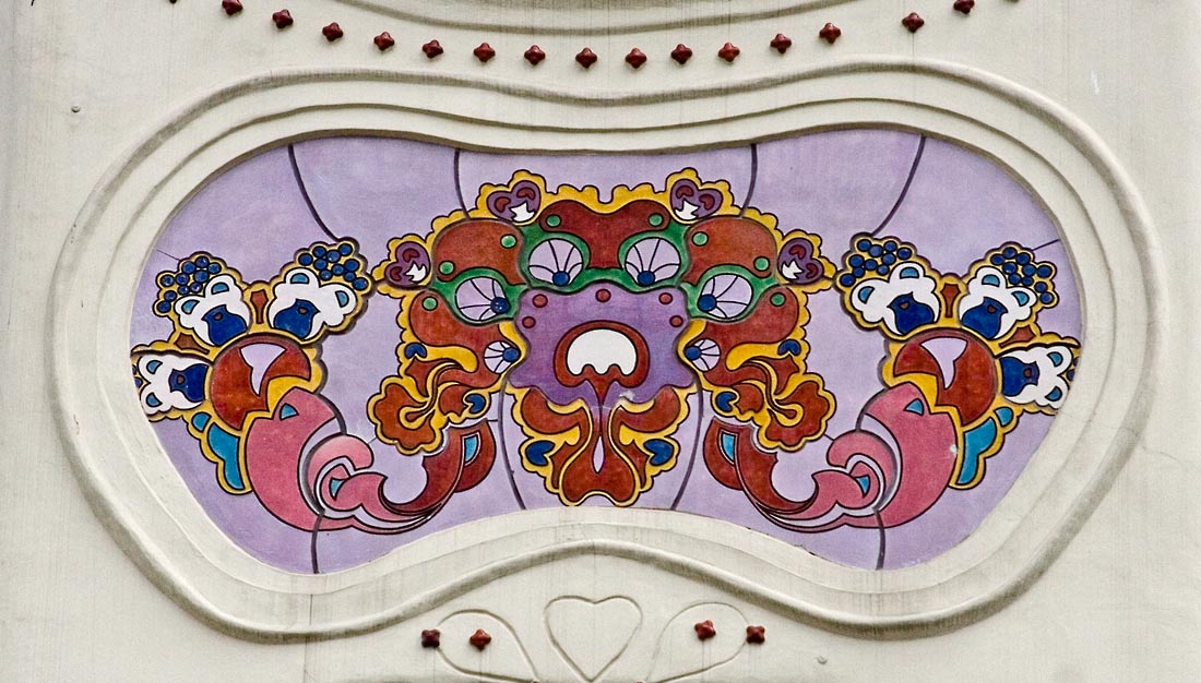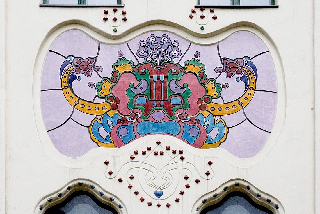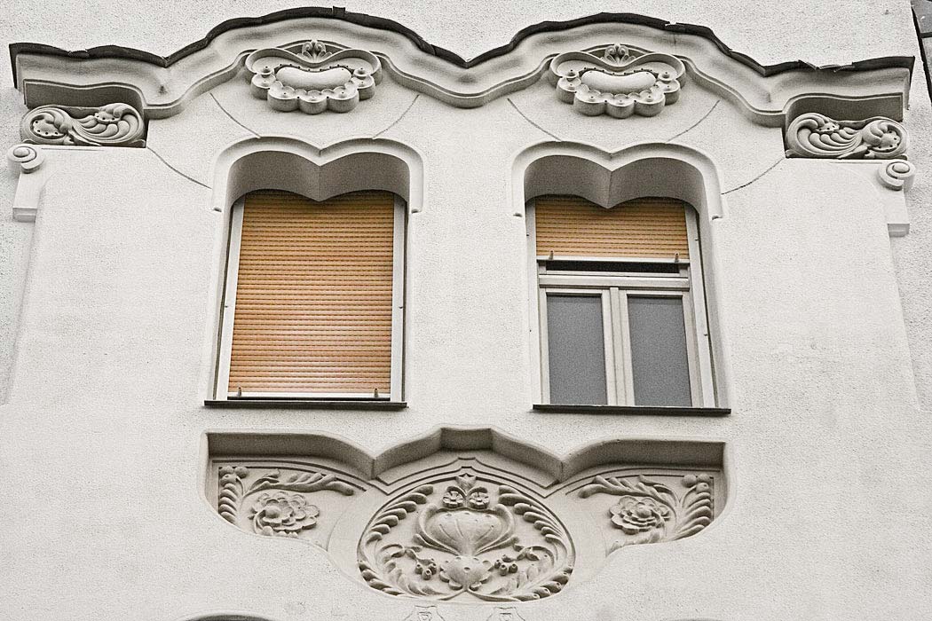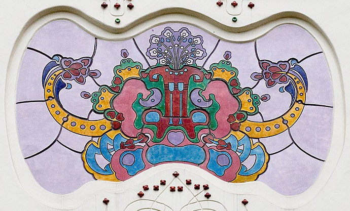 z épület első tervén a díszítés már szecessziós, de annak hagyományosabb módján veszi körbe az ablakokat. A két egymásfeletti ablakot körbevevő nagy keret pedig még bonyolult rajzolatú. A végső kivitelben viszont a homlokzat díszei már nem az ablak függvényei, azzal egyenrangú elemek és nem is akármilyenek, e díszek egyedülállóan fantáziadús dekorációk, melyek akár önálló művészi alkotásnak is elfogadhatók. A dekoráció viszonylag függetlenedik az épülettől, ahogy azt Európa élvonalában járó szecessziós építészeknél is látjuk ebben az időben.A