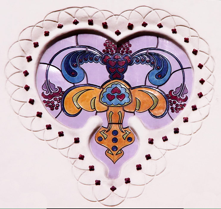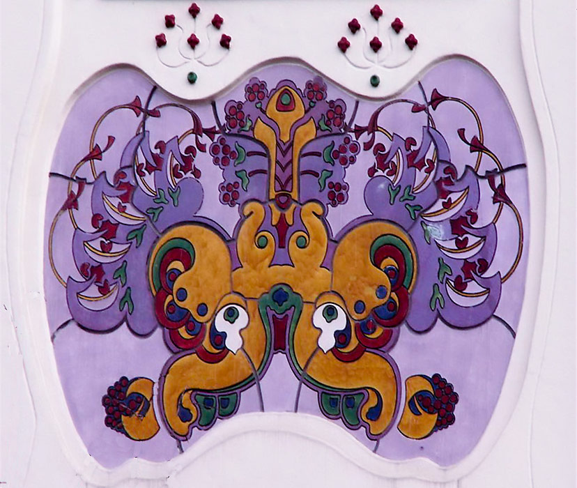 dekorációs betétet keretező falfelület szecessziós forma, a minta benne viszont teljesen egyéni fantázia. Ebben látunk ugyan népies részleteket, mint ahogy ezt sokan hangsúlyozzák, de személyes véleményünk szerint itt Márkus Géza a keleti színes illusztrációkból is merít, főleg a régi tűzzománcból készült edények díszítőstílusából. KATT az alábbi képre a 7 tagú sorozathozH