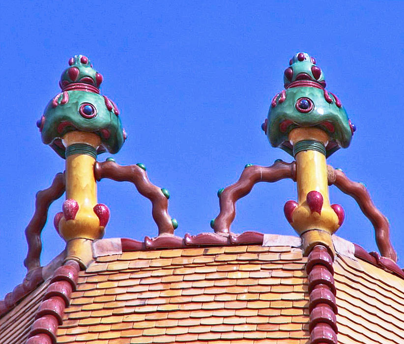 hogyan Márkus a népies motívumokat játékos vonalvezetésű műalkotásokká alakítja át, azok szinte eleven lényekké változnak át. Nem is találunk ehhez hasonlót a századforduló magyar építészetében. A katalán Gaudi tud hasonló módon szinte élő dekorációt létrehozni, aki a hagyományos mór épületdíszeket alakítja át, rakja össze művészi szinten szürreális lényekké.A Cifrapalota kerámia betétei