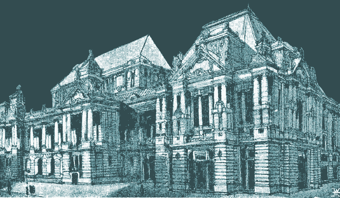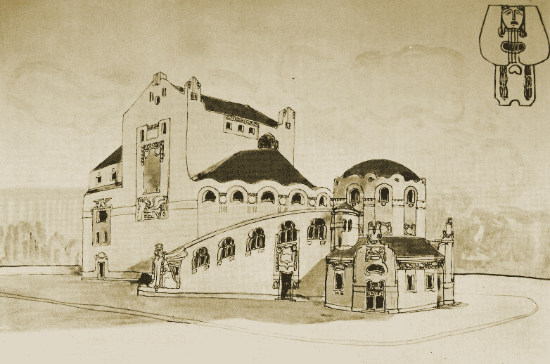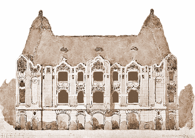 tt Márkus Géza a historikus építészetben ritka, a szecessziós épületeknél viszont gyakoribb megoldással aszimmetrikus tervet készített. Mesterének, a szimmetriától nem ennyire eltávolodó Lechner Ödönnek kevésbé tetszett volna, de végül is ez még terv, még nem is egy konkrét feladathoz kötődött, ami ha kivitelezésre kerül, tovább csíszolódik.A