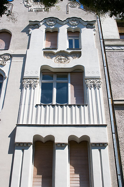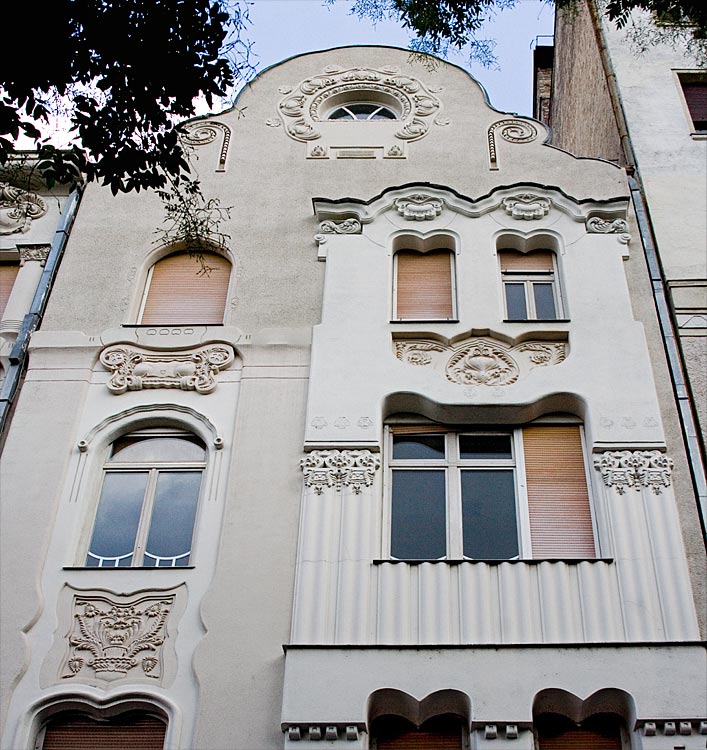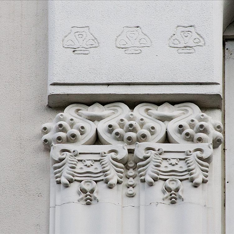 z épület itt, már nem annyira az egyéni fantáziadús ötletekkel bíró Márkust mutatja nekünk, inkább a már akkor szokványos szecessziós ornamentációt. De azért nézzük meg közelebbről... (a részletek itt a köv. részben lentebb)Budapest, Bakáts tér 10, felújítva