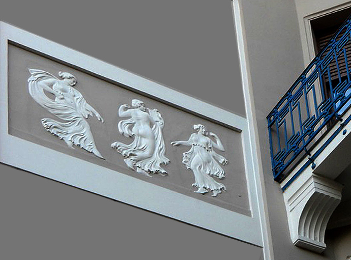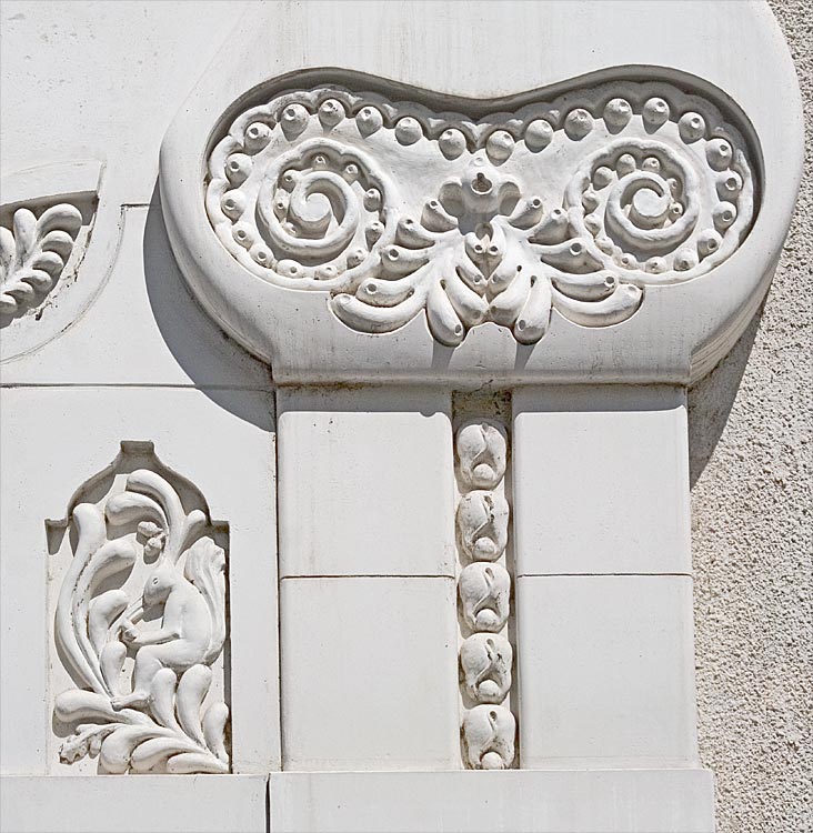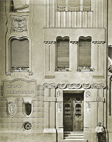 zt a dekoráció típust igaz, hogy nem Márkus Géza találta fel, de amit itt megvalósított, eredeti fantáziáról tesz tanuságot. A falsíkok sokasága, a részben aszimmetrikus kompozíció, az eltérő magasságú két rizalit, a minden emeleten más-más ablaktípus és az eleven formákból gyúrt organikus ill. alakos dekorbetétek külön nézve mind-mind vonzó látvány, így együtt a megfelelő helyekre téve pedig finom összhangba kerülnek, ahogy egy szanatóriumhoz illik. Az egymás felé helyezett falsíkokból ötöt számoltunk meg, kisebb színeltérés is kiemeli őket, ablaktípusból legalább ugyanannyi van. A stukkó dekor mindegyike külön-külön is műremek, ezeket is érdemes közelebbről megszemlélni (KATT a négy képre a négy képsorozathoz)Együttműködés Telcs Ede ill. Kallós Ede szobrászokkal.
