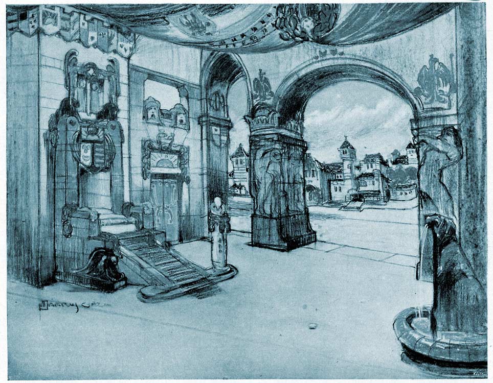 ÁRKUS GÉZA, (Budapest, 1872. április 6. – Budapest, 1912. december 6.) építészete szorosan összefonódott a színházzal. Több színházépület tervezésében vett részt, több színdarab díszleteit is elkészítette. Színpadi díszlet képeiben épületeket, városrészeket vázolt fel, a szecessziónak kedves régi, reneszánsz előtti korokból alakítva, romantikus részletekkel kiegészítve. (KATT alább két díszletképért) Az itt látható képen historikus nagy formák keverednek szecessziós részletekkel. Legismertebb épületén a kecskeméti Cifrapalotán is egyszerre érvényesül az építész és a dekoratőr festőművész."M