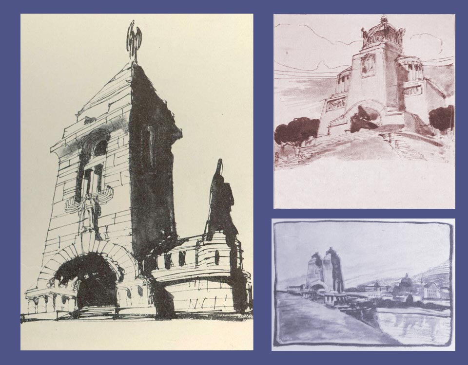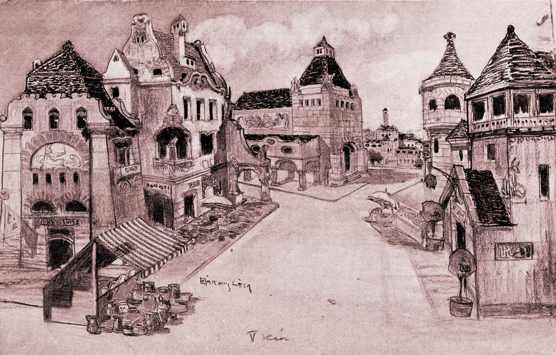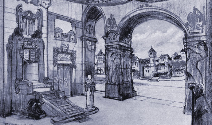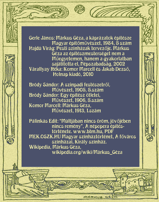 eg nem becsülhető frissesség és bátorság van "Az egyszer volt, hol nem volt" című mesedarab díszlet-terveiben... Az építő-festő a könnyű munka helyett, a nehezet, az értékeset, a művészit választotta. Alkotott, kitalált, kombinált egyéni módon..." (Bródy Sándor, A színpadi festészetről, Művészet, 1904, Ötödik szám)Épületrajzok