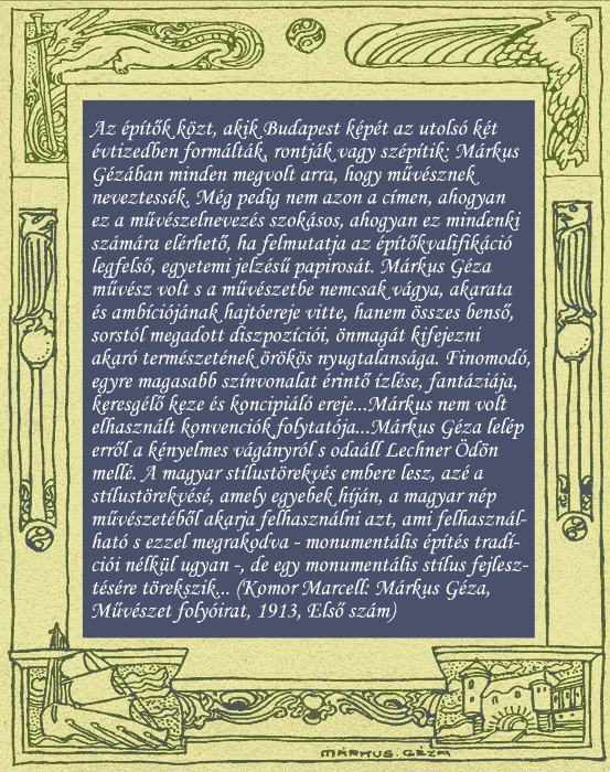 árkus Géza intim terveit kell néhány magyarázó szóval kísérnem. És ő is pesti. De mily különösen az. Most tavasszal voltam az atelierejében, melyet Kallós szobrásszal együtt tart. (Csuda, hogy nem társult egy festővel, egy íróval és egy muzsikussal is. Valamennyinek tudna ötletet adni és mind munkát adhatna neki.)... Egy festő atelierje a Márkus Gézáé. Minden zug tele a színtől szikrázó épületarcokkal, en face és en profil. Színházak vidám arculatai, komor emlékalakok, kecses nyaraló-helyek... Ha fontoskodni akarnék, azt mondanám, hogy valami gótikus ize van mégis mindnek. De ha jól meggondolom, inkább jellemzi egy rejtelmeskedő naivitás. Meg kell magyaráznom, hogy mit értek ezalatt. -- Azt, hogy ez építőmesterben megvan az építésben való hit, neki az nagy és szent dolog. Él benne a sajátságos ösztön, amely bizonyos vonalakat szenvedélyesen kíván."A Cifrapalota, Kecskemét, 1902