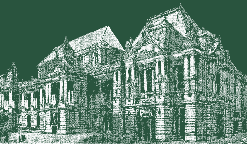 űvészet folyóirat, 1913, Első szám. A szöveg részlet az építészt méltató cikkből. A keret Márkus Géza a Művészetben előzőleg közzétett rajzból készült.Budapesti árú- és értéktőzsde - pályázatterv